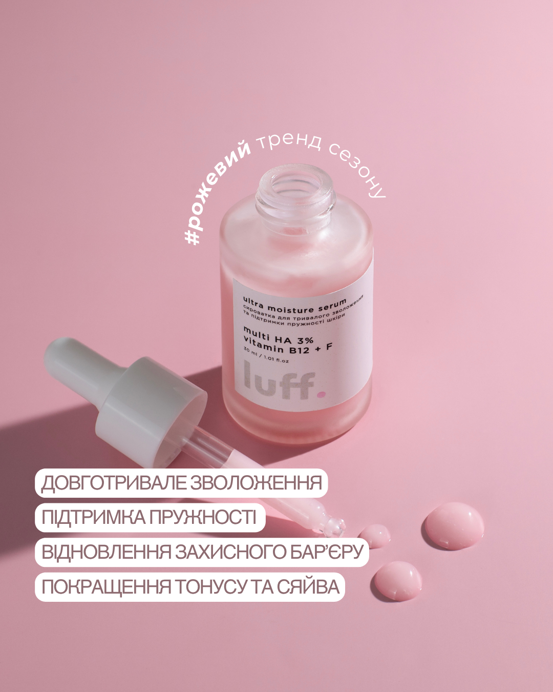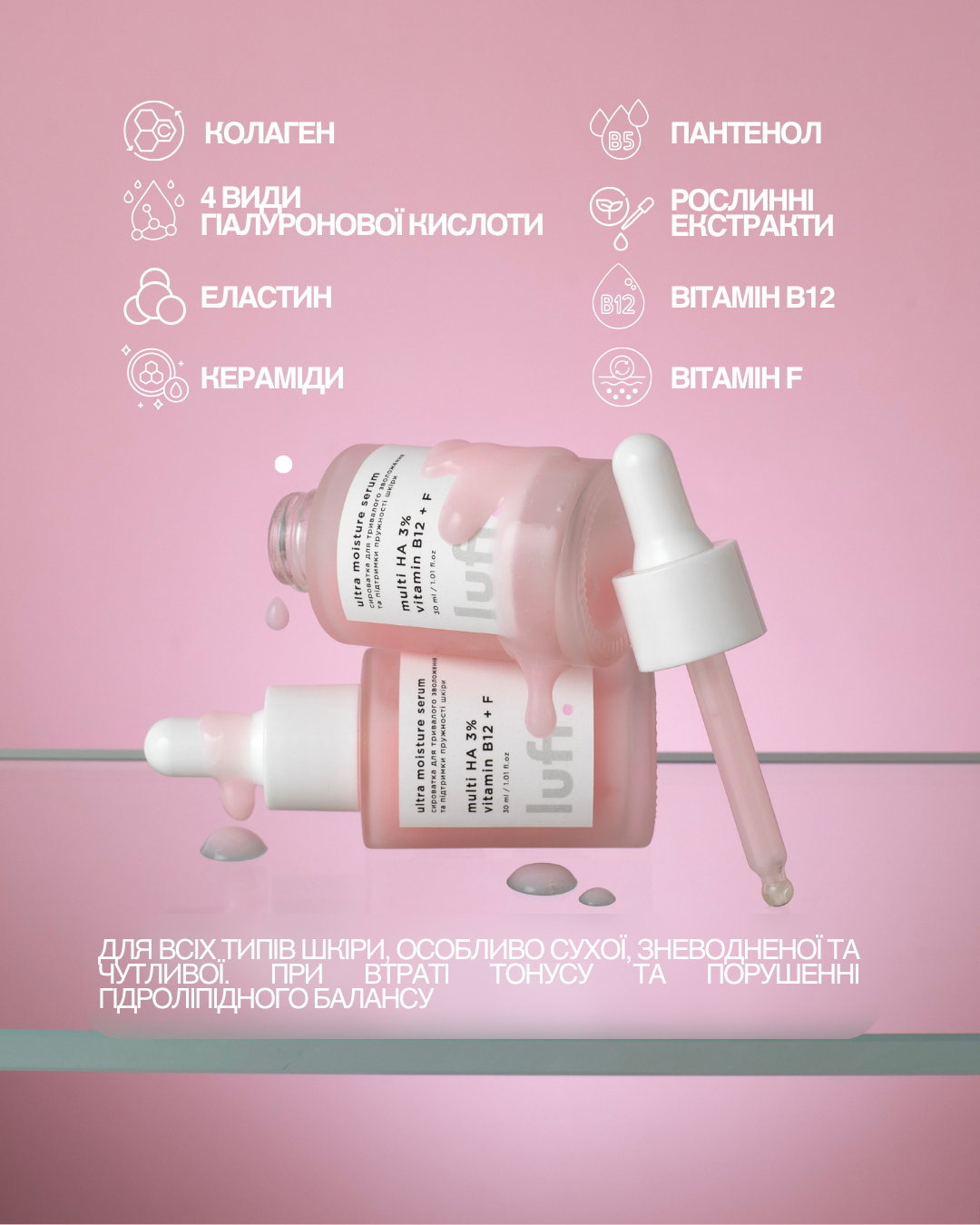 Сироватка, що забезпечує інтенсивне та тривале зволоження, відновлює бар’єрні функції шкіри та підтримує її пружність. Завдяки багаторівневій гіалуроновій кислоті, цінним вітамінам і природним екстрактам засіб ефективно насичує клітини вологою, підвищує еластичність та сприяє здоровому сяйву шкіри.