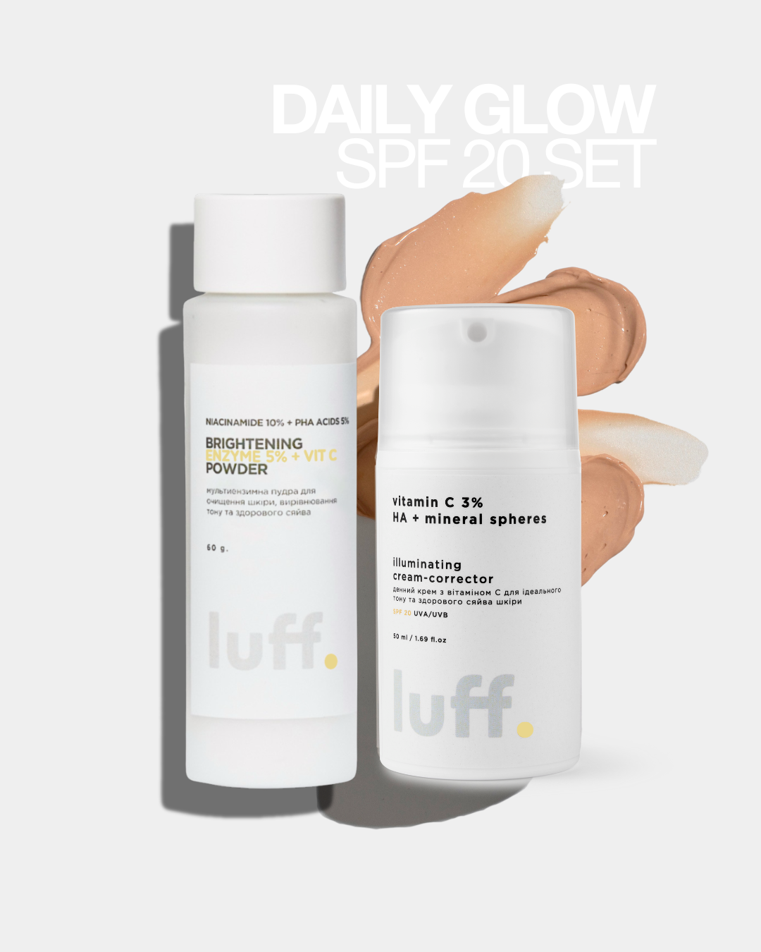 Дует для сяйва: ензимне оновлення з ніацинамідом та вітаміном С + щоденний крем-коректор з вітаміном С SPF 20, які вирівнюють тон, очищують пори та повертають шкірі здорове сяйво з перших тижнів.